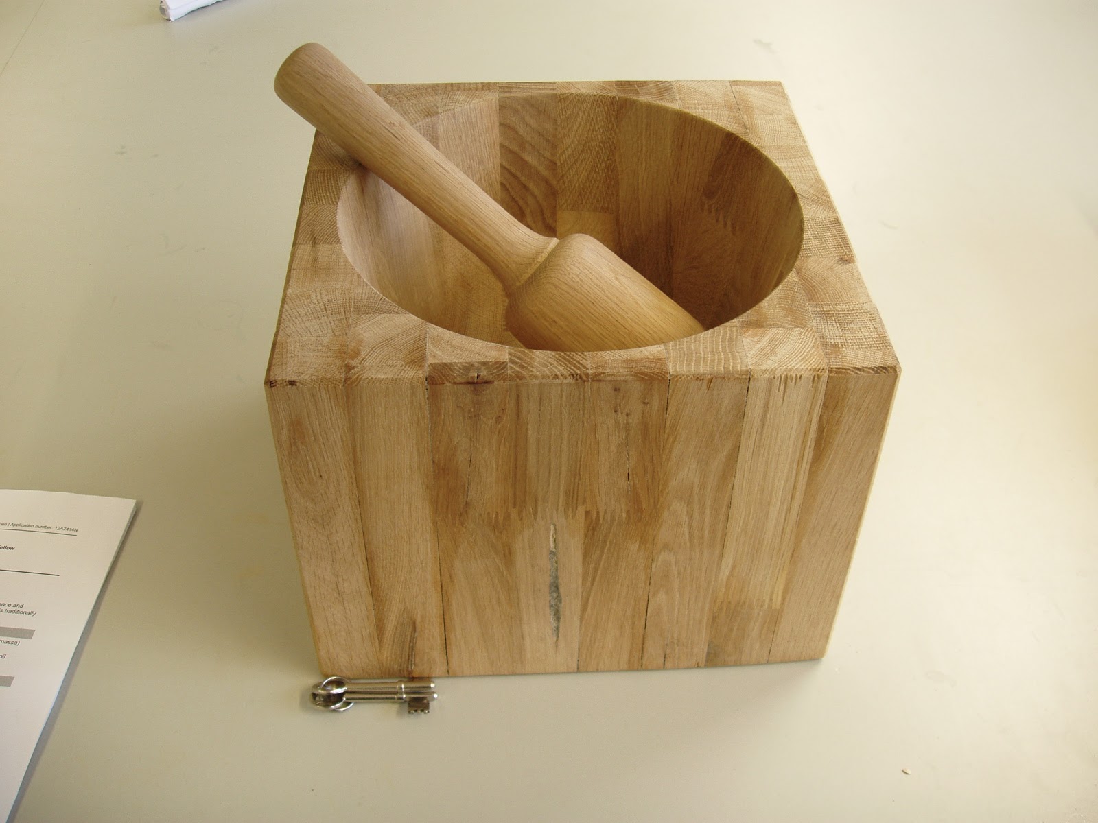 It's a lovely extra large pestle and mortar for breaking up soil, made to order from recycled oak kitchen worktops by Terry Vaughan (http://www.turnedwoodenbowls.com/). Far cheaper than buying a ceramic one from VWR or Fisher and far more satisfying to have in the lab. as well. Cheers Terry, good job.